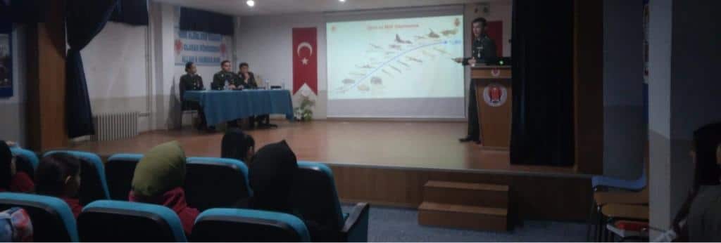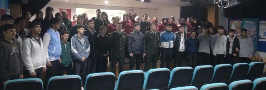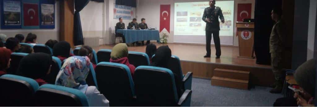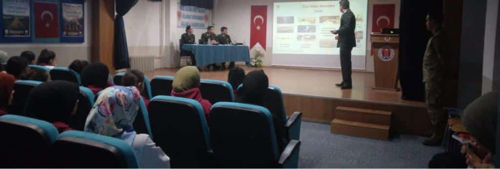 Okulumuz öğrencilerine yönelik ilimizde bulunan 25. Hudut Tugayı Komutanlığı Komutanları tarafından Milli Savunma Üniversitesi (MSÜ) ve askerlik mesleği tanıtımı yapılmıştır. Öğrencilere askerlik mesleğinin avantajları, MSÜ’ye giriş şartları, sınav süreci, sağlık yönetmeliği vb. konularda ayrıntılı bilgi verilerek MSÜ ‘nün tanıtım videoları izletilmiştir.